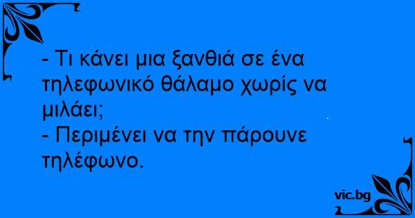 - Tι κάνει μια ξανθιά σε ένα τηλεφωνικό θάλαμο χωρίς να μιλάει;<br />- Περιμένει να την πάρουνε τηλέφωνο.
