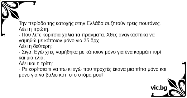 - Που λέτε κορίτσια χάλια τα πράγματα. Χθες αναγκάστηκα να γαμηθώ με κάποιον μόνο για 35 δρχ.