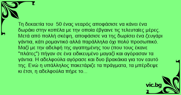 Μαζί με την αδελφή της αγαπημένης του (που τους έκανε "πλάτες") πήγαν σε ένα ειδικευμένο μαγαζί και αγόρασαν τα γάντια. Η αδελφούλα αγόρασε και δυο βρακάκια για τον εαυτό της. Ενώ η υπάλληλος πακετάριζε τα πράγματα, τα μπέρδεψε κι έτσι, η αδελφούλα πήρε το πακέτο με τα γάντια ενώ τα βρακάκια στάλθηκαν στην αγαπημένη του νεαρού με το παρακάτω συνοδευτικό σημείωμα: