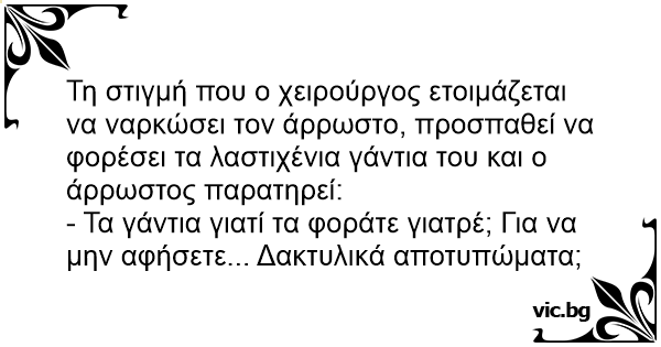 Τη στιγμή που ο χειρούργος ετοιμάζεται να ναρκώσει τον άρρωστο, προσπαθεί να φορέσει τα λαστιχένια γάντια του και ο άρρωστος παρατηρεί: