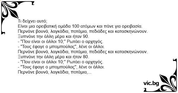 Είναι μια ορειβατική ομάδα 100 ατόμων και πάνε για ορειβασία. Περνάνε βουνά, λαγκάδια, ποτάμια, πεδιάδες και κατασκηνώνουν. Ξυπνάνε την άλλη μέρα και ήταν 90.