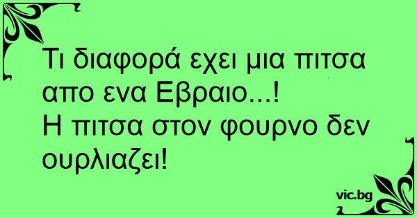 Hvad er foreskellen mellem en jøde og en pizza? Pizzaen skriger ikke når du sætter den i ovnen Omkring 10 kroner Du tager pizzaen ud i ét stykke