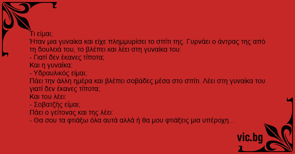 Ήταν μια γυναίκα και είχε πλημμυρίσει το σπίτι της. Γυρνάει ο άντρας της από τη δουλειά του, το βλέπει και λέει στη γυναίκα του: