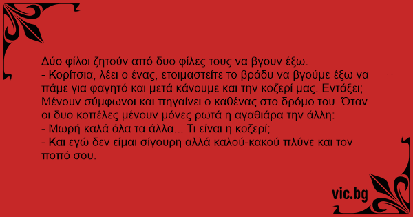 - Κορίτσια, λέει ο ένας, ετοιμαστείτε το βράδυ να βγούμε έξω να πάμε για φαγητό και μετά κάνουμε και την κοζερί μας. Εντάξει;