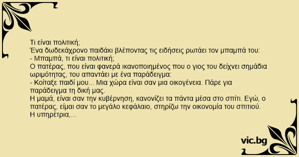 Капиталист, Влада, Народот… Was ist Politik Разговор между баща и син: Татко, какво е това политика? Un bambino va dal padre e dice: Подходит маленький сын к отцу и спрашивает: A little boy goes to his dad and asks, "What is politics?" Un fils demande à son père : Иванчо се прибира от училище, баща му го пита какво са учили. Маленький мальчик идет к отцу и просит объяснить ему, что такое политика. O garotinho pergunta ao pai: Pierre revient de l'école et dit à son père: - Papa, demain j'ai un devoir sur la politique, tu peux m'en parler ? - Bien sûr! Je pense que la meilleure méthode pour te parler de politique c'est de faire une analogie avec notre famille: Je suis capitaliste car je nourris la famille. Ta mère... Een zoon vraagt aan zijn vader: Pap, wat is eigenlijk politiek. Vader zegt: Jongen, dat is heel eenvoudig. Kijk, Ik breng het geld thuis, dus ben ik het KAPITALISME. Je moeder beheert het geld, dus... "Baba hayat bilgisi dersinde yonetimleri isliyoruz, bana demokrasiyi anlatirmisin?" demis. Babasi: "anlatmasina anlatirimda yavrum ama senin bazi tanimlari bilmen gerekiyor" demis, "Bak simdi... En liten pojke frågar sin far: - Far, jag ska skriva en uppsats i skolan, får jag ställa dig en fråga? - Självklart min son, fråga på! - Vad är politik, far? - Tja.. i politiken finns det 5... En 7-årig pojke frågade sin pappa: - Pappa vad är politik för något? Pappan svarade: - Jo, jag ska förklara för dig. Det år så här. När jag kommer hem med lönen då är jag KAPITALISM, din mamma... O garoto pergunta a seu pai: - O que é política papai? E seu pai responde: - Vou pegar o exemplo de casa p/ responder...sua mãe é o GOVERNO porque cuida de você, eu sou o CAPITALISMO porque... Едно дете го прашува својот татко: - Тато што е тоа политика? - Епа тоа ти е вака сине: Јас во фамилијава заработувам, значи јас сум капитализам, јас им плаќам на чистачката и дадилката значи тие... - Isä, meillä on ainekirjoitusta koulussa. Saanko kysyä jotain ? - Tietysti, poikani! Kysy pois. - Mikä on politiikka? - No jaa, politiikassa on viisi ryhmää: 1) kansa 2) hallitus 3) talousvalta 4)... Ali 3. sınıfa giden zeki bir çocuktur.bir gün öğretmeni Ali'ye "SİYASET" nedir diye sorar. Ali düşünür ama o çocuk aklıyla cevap veremez. Eve gider kitaplara bakar ama hiçbirşey anlayamaz. O da... Fragt der Sohn seinen Vater, was Politik sei. Daraufhin der Vater: "Das ist schwer zu erklären…, nehmen wir zum Beispiel unsere Familie, ich bringe das Geld nach Hause, also nennt man mich... O filho fala para o pai: — Pai, eu preciso fazer um trabalho para a escola, posso te fazer uma pergunta? — Claro meu filho. Qual é a pergunta? — O que é Política, pai? — Bem, vou usar a nossa casa... Malý synek se ptá tatínka, co je to kapitalismus. Tatínek chvíli přemýšlí a pak začne povídat: „Já jsem živitel rodiny, chlapče, já budu KAPITALISTA. Tvoje matka se stará o rodinné finance, budeme... A kisfiú kérdezi az apját, hogy mi a politika. Az apja leülteti, és példákkal elmagyarázza: - Figyelj, fiam. Én hozom haza a pénzt, tehát én vagyok a KAPITALIZMUS. - Anyád ügyel a pénzre, tehát ő a... Un copil isi intreaba parintele: - Taticule ce-i aia Politica? Taica-su ii explica: - Eu aduc banii in casa: sunt Finantele; maica-ta scoate banii din casa, ea este Guvernul; bunicul are grija ca... Qu'est-ce que la politique? Un enfant demande à son papa : - « Expliques-moi ce que c’est que la politique ». Le papa répond : - « C’est très simple. Je vais te donner un exemple. Dans notre... Den 7-årig pojke frågade sin pappa: - Pappa, vad är politik? - Jo, det är såhär: när jag kommer hem med lönen är jag KAPITALISM, din mamma som bestämmer här hemma är REGERINGEN, din farfar som ser... El profesor le pide al sus alumnos investigen que es la democracia Jaimito va con su papá y le dice Papá explicame que es la democracia Bueno hijo yo como soy el que manda en la casa soy el... Підходить маленький син до батька й запитує: — Тато, скажи, що таке політика? — Поясню тобі на прикладі нашої родини. От дивися: Я заробляю гроші, це означає що я міністерство фінансів. Мама... Pierino chiede a suo papà: "Papà cos'è la politica?" Il papà risponde: "Ti faccio un esempio, io sono il capitalista perchè porto i soldi a casa, tua madre è il governo perchè gestisce i soldi, la... Pappan har sin lille son med sig på ett politiskt möte. Väl hemma igen vid middagsbordet frågar pojken: - Pappa, vad är en kamrat? - Det kan man säga att du och jag är. - Men vad är folket då? -... Papá papá, no entiendo lo que es la política ¿me lo podrías explicar? - Claro hijo. Pues verás, tu madre es la que administra el dinero, sería la administación, yo soy el que lo trae, sería el... Un niño le pregunta al papá: ¿Qué es la política? El padre le contesta: Mira hijo, yo soy el Proveedor, el que trae la plata a la casa, tu mamá es el Gobierno, el que distribuye la plata, la nana... En rentrant de l'école, Toto dit à son père : - Papa, j'ai un exposé sur la politique à faire pour demain. Tu pourrais m'aider ? - Bien sûr ! Son père réfléchit pendant quelques minutes : - Je... Jānītis prasa tēvam: – Tēt, pastāsti kas ir politika? Tētis: – Nu skaties, piemēram, mūsu ģimene. Es pelnu naudu, tātad es esmu finanšu ministrija. Mamma vada saimniecību, tātad viņa ir valdība.... Um garotinho chega pro seu pai e 