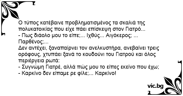 Ο τύπος κατέβαινε προβληματισμένος τα σκαλιά της πολυκατοικίας που είχε πάει επίσκεψη στον Γιατρό...
