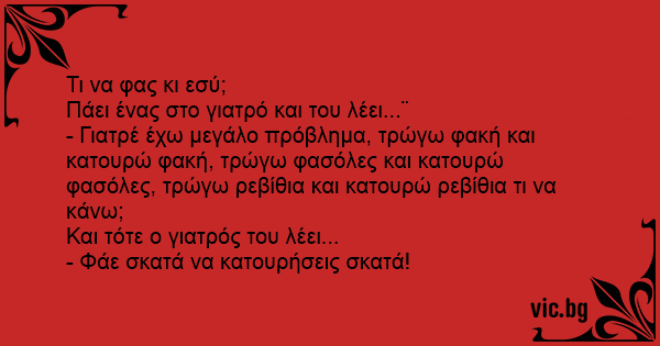 - Γιατρέ έχω μεγάλο πρόβλημα, τρώγω φακή και κατουρώ φακή, τρώγω φασόλες και κατουρώ φασόλες, τρώγω ρεβίθια και κατουρώ ρεβίθια τι να κάνω;