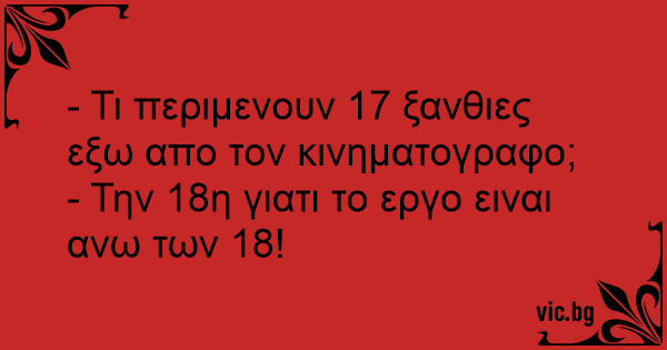 Stoji 17 plavusa ispred kazina! Dolazi policajac i kaze: - Sto ne ulazite unutra? A one mu kazu: - Umijes li ti citat. Vidis li da piše zabranjen ulaz ispod 18!
