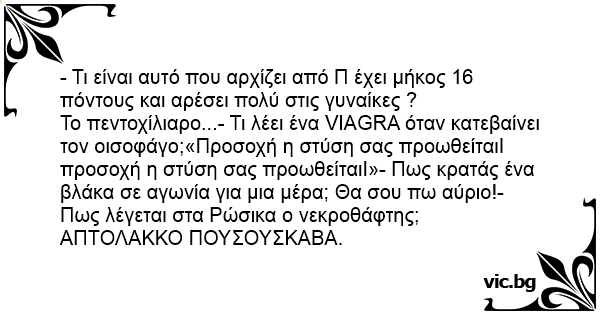 Το πεντοχίλιαρο...- Τι λέει ένα VIАGRА όταν κατεβαίνει τον οισοφάγο;«Προσοχή η στύση σας προωθείταιΙ προσοχή η στύση σας προωθείταιΙ»- Πως κρατάς ένα βλάκα σε αγωνία για μια μέρα; Θα σου πω αύριο!- Πως λέγεται στα Ρώσικα ο νεκροθάφτης; ΑΠΤΟΛΑΚΚΟ ΠΟΥΣΟΥΣΚΑΒΑ.
