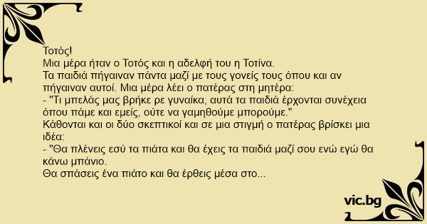- "Τοτίνα πρόσεχε μην σπάσεις κανένα πιάτο γιατί θα μας γαμήσει ο μπαμπάς!
