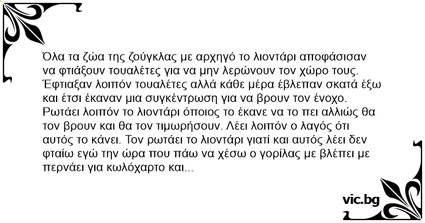 Ρωτάει λοιπόν το λιοντάρι όποιος το έκανε να το πει αλλιώς θα τον βρουν και θα τον τιμωρήσουν. Λέει λοιπόν ο λαγός ότι αυτός το κάνει. Τον ρωτάει το λιοντάρι γιατί και αυτός λέει δεν φταίω εγώ την ώρα που πάω να χέσω ο γορίλας με βλέπει με περνάει για κωλόχαρτο και μετά με πετάει έξω.
