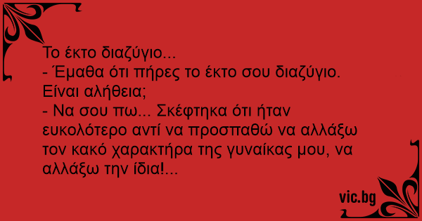 - Να σου πω... Σκέφτηκα ότι ήταν ευκολότερο αντί να προσπαθώ να αλλάξω τον κακό χαρακτήρα της γυναίκας μου, να αλλάξω την ίδια!...