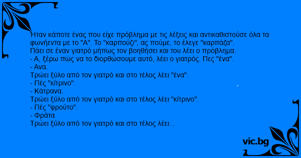 Ήταν κάποτε ένας που είχε πρόβλημα με τις λέξεις και αντικαθιστούσε όλα τα φωνήεντα με το "Α". Το "καρπούζι", ας πούμε, το έλεγε "καρπάζα". Πάει σε έναν γιατρό μήπως τον βοηθήσει και του λέει ο πρόβλημα. - Α, ξέρω πώς να το διορθώσουμε αυτό, λέει ο γιατρός. Πες "ένα". - Ανα. Τρώει ξύλο από τον γιατρό και στο τέλος λέει "ένα". - Πές "κίτρινο". - Κάτρανα. Τρώει ξύλο από τον γιατρό και στο τέλος λέει "κίτρινο". - Πές "φρούτο". - Φράτα. Τρώει ξύλο από τον γιατρό και στο τέλος λέει "φρούτο". - Τώρα πες "ένα κίτρινο φρούτο". - Ανα κάτρανα φράτα! Τρώει ξύλο, κλωτσιές μπουνιές από τον γιατρό. - Πες "ένα κίτρινο φρούτο". - Μπανάνα!