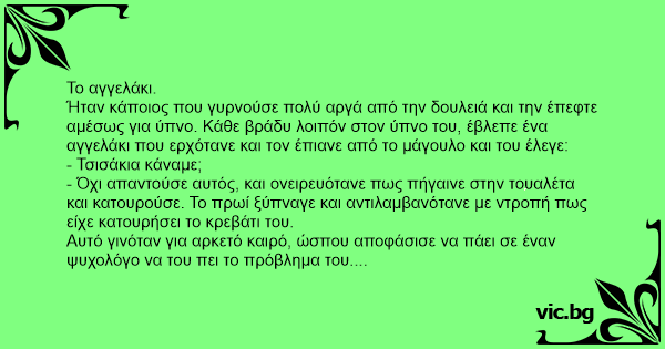 Αυτό γινόταν για αρκετό καιρό, ώσπου αποφάσισε να πάει σε έναν ψυχολόγο να του πει το πρόβλημα του. Του λέει ο ψυχολόγος: