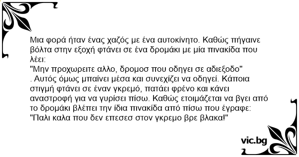Μια φορά ήταν ένας χαζός με ένα αυτοκίνητο. Καθώς πήγαινε βόλτα στην εξοχή φτάνει σε ένα δρομάκι με μία πινακίδα που λέει: