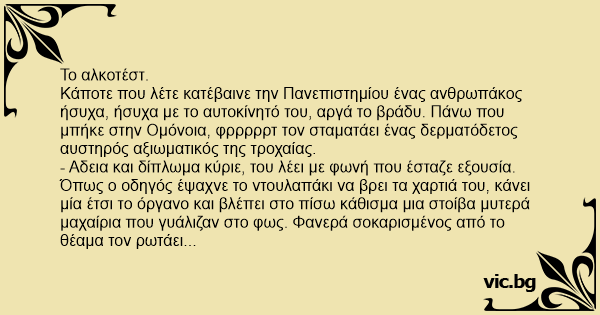 Κάποτε που λέτε κατέβαινε την Πανεπιστημίου ένας ανθρωπάκος ήσυχα, ήσυχα με το αυτοκίνητό του, αργά το βράδυ. Πάνω που μπήκε στην Ομόνοια, φρρρρρτ τον σταματάει ένας δερματόδετος αυστηρός αξιωματικός της τροχαίας.