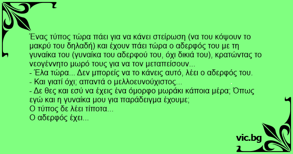 Ένας τύπος τώρα πάει για να κάνει στείρωση (να του κόψουν το μακρύ του δηλαδή) και έχουν πάει τώρα ο αδερφός του με τη γυναίκα του (γυναίκα του αδερφού του, όχι δικιά του), κρατώντας το νεογέννητο μωρό τους για να τον μεταπείσουν...