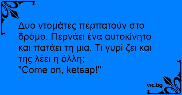 Δυο ντομάτες περπατούν στο δρόμο. Περνάει ένα αυτοκίνητο και πατάει τη μια. Τι γυρί ζει και της λέει η άλλη;