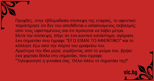 Προχθές, στην εβδομαδιαία σύσκεψη της εταιρίας, το αφεντικό παρατήρησε ότι δεν του αποδίδεται ο απαιτούμενος σεβασμός από τους υφισταμένους και ότι πρόκειται να λάβει μέτρα.