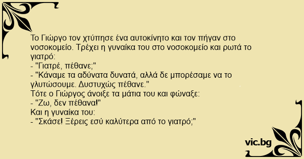 Το Γιώργο τον χτύπησε ένα αυτοκίνητο και τον πήγαν στο νοσοκομείο. Τρέχει η γυναίκα του στο νοσοκομείο και ρωτά το γιατρό: