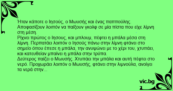 Mooses, Jeesus ja vanha mies oli pelaamassa golfia. Mooses asteli tiille ja löi palloa. Se meni peliväylän ohi ja laskeutui vesiesteeseen. Mooses halkaisi veden ja löi pallon greenille. Jeesus...