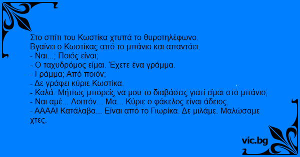 - Καλά. Μήπως μπορείς να μου το διαβάσεις γιατί είμαι στο μπάνιο;