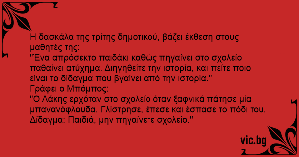 "Ο Λάκης ερχόταν στο σχολείο όταν ξαφνικά πάτησε μία μπανανόφλουδα. Γλίστρησε, έπεσε και έσπασε το πόδι του.