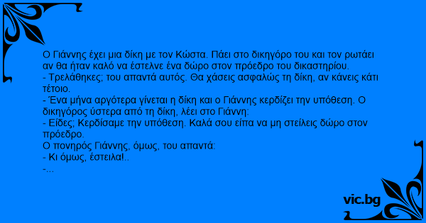 Ο Γιάννης έχει μια δίκη με τον Κώστα. Πάει στο δικηγόρο του και τον ρωτάει αν θα ήταν καλό να έστελνε ένα δώρο στον πρόεδρο του δικαστηρίου.