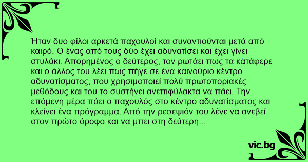 Ήταν δυο φίλοι αρκετά παχουλοί και συναντιούνται μετά από καιρό. Ο ένας από τους δύο έχει αδυνατίσει και έχει γίνει στυλάκι. Απορημένος ο δεύτερος, τον ρωτάει πως τα κατάφερε και ο άλλος του λέει πως πήγε σε ένα καινούριο κέντρο αδυνατίσματος, που χρησιμοποιεί πολύ πρωτοποριακές μεθόδους και του το συστήνει ανεπιφύλακτα να πάει. Την επόμενη μέρα πάει ο παχουλός στο κέντρο αδυνατίσματος και κλείνει ένα πρόγραμμα. Από την ρεσεψιόν του λένε να ανεβεί στον πρώτο όροφο και να μπει στη δεύτερη πόρτα δεξιά. Μπαίνει μέσα και βλέπει μια απίστευτη γκόμενα, φορώντας πολύ σέξι εσώρουχα, να τον κοιτάζει με λάγνο βλέμμα και να του λέει: