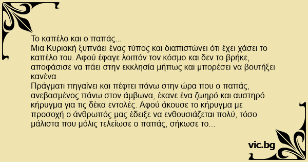 Μια Κυριακή ξυπνάει ένας τύπος και διαπιστώνει ότι έχει χάσει το καπέλο του. Αφού έφαγε λοιπόν τον κόσμο και δεν το βρήκε, αποφάσισε να πάει στην εκκλησία μήπως και μπορέσει να βουτήξει κανένα.