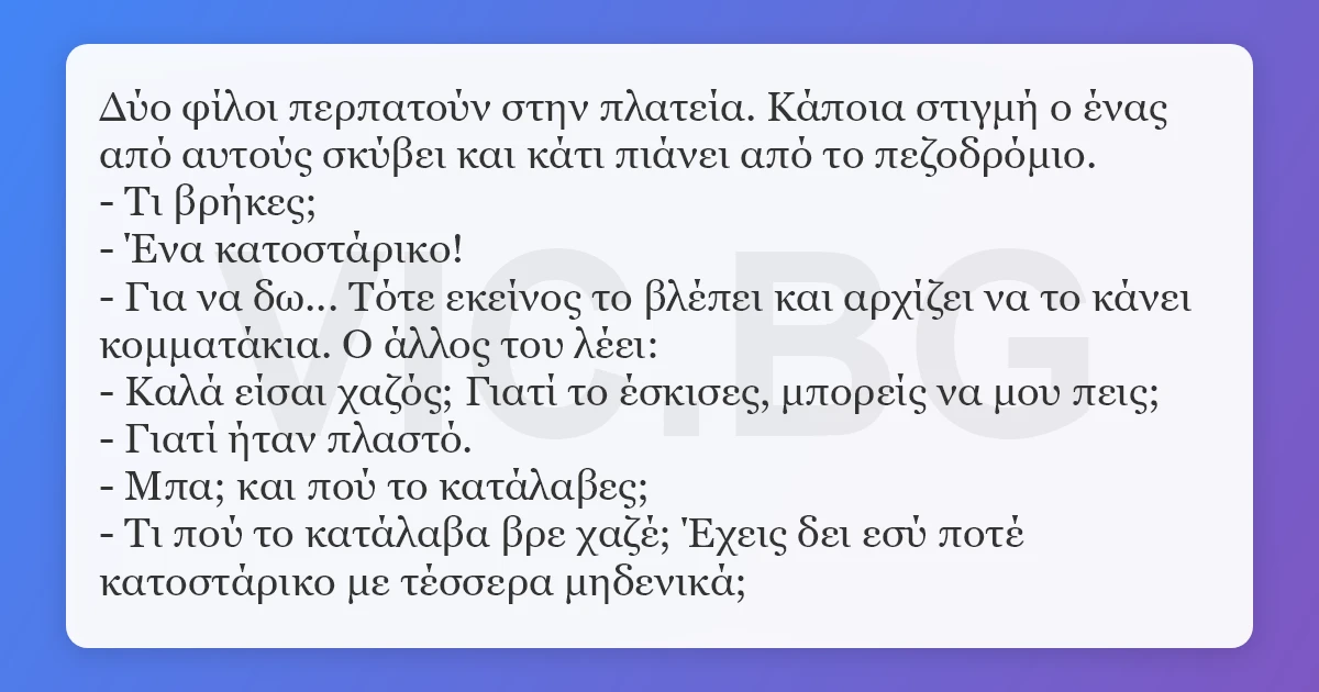 Δύο φίλοι περπατούν στην πλατεία. Κάποια στιγμή ο ένας από αυτούς σκύβει και κάτι πιάνει από το πεζοδρόμιο. - Τι βρήκες; - Ένα κατοστάρικο! - Για να δω... Τότε εκείνος το βλέπει και αρχίζει να το κάνει κομματάκια. Ο άλλος του λέει: - Καλά είσαι χαζός; Γιατί το έσκισες, μπορείς να μου πεις; - Γιατί ήταν πλαστό. - Μπα; και πού το κατάλαβες; - Τι πού το κατάλαβα βρε χαζέ; Έχεις δει εσύ ποτέ κατοστάρικο με τέσσερα μηδενικά;