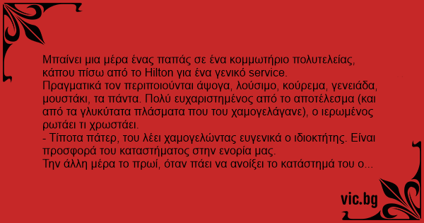 Πραγματικά τον περιποιούνται άψογα, λούσιμο, κούρεμα, γενειάδα, μουστάκι, τα πάντα. Πολύ ευχαριστημένος από το αποτέλεσμα (και από τα γλυκύτατα πλάσματα που του χαμογελάγανε), ο ιερωμένος ρωτάει τι χρωστάει.