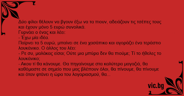 Δύο φίλοι θέλουν να βγουν έξω να τα πιουν, αδειάζουν τις τσέπες τους και έχουν μόνο 5 ευρώ συνολικά.