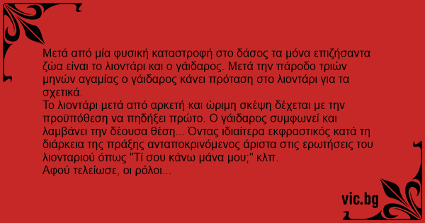 Μετά από μία φυσική καταστροφή στο δάσος τα μόνα επιζήσαντα ζώα είναι το λιοντάρι και ο γάιδαρος. Μετά την πάροδο τριών μηνών αγαμίας ο γάιδαρος κάνει πρόταση στο λιοντάρι για τα σχετικά.
