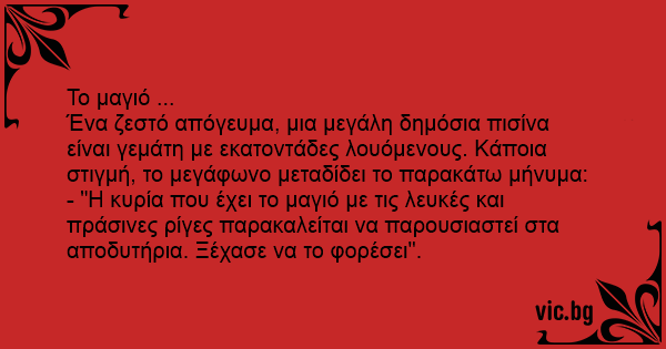 - "Η κυρία που έχει το μαγιό με τις λευκές και πράσινες ρίγες παρακαλείται να παρουσιαστεί στα αποδυτήρια. Ξέχασε να το φορέσει".