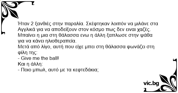 Ήταν 2 ξανθιές στην παραλία. Σκέφτηκαν λοιπόν να μιλάνε στα Αγγλικά για να αποδείξουν στον κόσμο πως δεν ειναι χαζές.