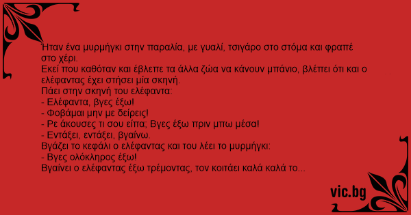 Βγαίνει ο ελέφαντας έξω τρέμοντας, τον κοιτάει καλά καλά το μυρμήγκι και του λέει: