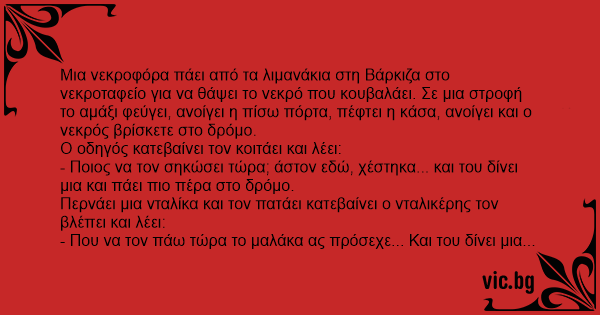Μια νεκροφόρα πάει από τα λιμανάκια στη Bάρκιζα στο νεκροταφείο για να θάψει το νεκρό που κουβαλάει. Σε μια στροφή το αμάξι φεύγει, ανοίγει η πίσω πόρτα, πέφτει η κάσα, ανοίγει και ο νεκρός βρίσκετε στο δρόμο.