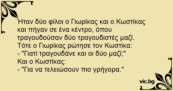 Ήταν δύο φίλοι ο Γιωρίκας και ο Κωστίκας και πήγαν σε ένα κέντρο, όπου τραγουδούσαν δύο τραγουδιστές μαζί.