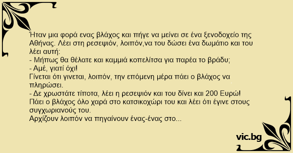 Ήταν μια φορά ενας βλάχος και πήγε να μείνει σε ένα ξενοδοχείο της Αθήνας. Λέει στη ρεσεψιόν, λοιπόν,να του δώσει ένα δωμάτιο και του λέει αυτή: