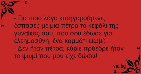 - Για ποιο λόγο κατηγορούμενε, έσπασες με μια πέτρα το κεφάλι της γυναίκας σου, που σου έδωσε για ελεημοσύνη, ένα κομμάτι ψωμί;