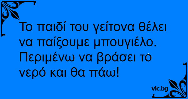 Το παιδί του γείτονα θέλει να παίξουμε μπουγιέλο. Περιμένω να βράσει το νερό και θα πάω!