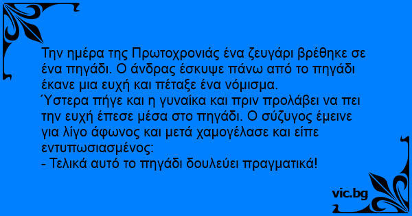 Ύστερα πήγε και η γυναίκα και πριν προλάβει να πει την ευχή έπεσε μέσα στο πηγάδι. Ο σύζυγος έμεινε για λίγο άφωνος και μετά χαμογέλασε και είπε εντυπωσιασμένος: