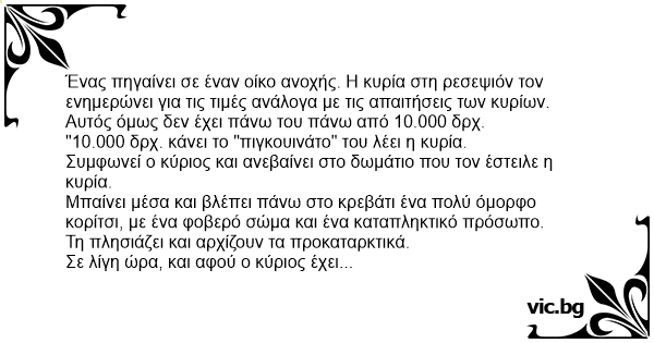 Ένας πηγαίνει σε έναν οίκο ανοχής. Η κυρία στη ρεσεψιόν τον ενημερώνει για τις τιμές ανάλογα με τις απαιτήσεις των κυρίων. Αυτός όμως δεν έχει πάνω του πάνω από 10.000 δρχ.