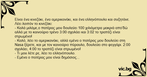 - Καλό, λέει το αμερικανάκι, αλλά εμένα ο πατέρας μου δουλεύει στη Nasa ξέρετε, και με τον καινούριο πύραυλο, δουλεύει στο φεγγάρι. 2:00 σχολάει, 4:00 το τραπέζι είναι στρωμένο!