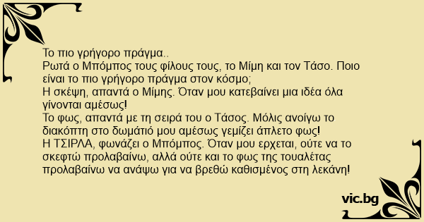 Ρωτά ο Μπόμπος τους φίλους τους, το Μίμη και τον Τάσο. Ποιο είναι το πιο γρήγορο πράγμα στον κόσμο;