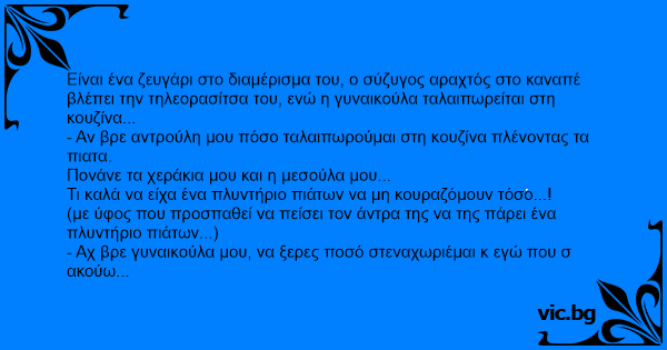 - Αν βρε αντρούλη μου πόσο ταλαιπωρούμαι στη κουζίνα πλένοντας τα πιατα.