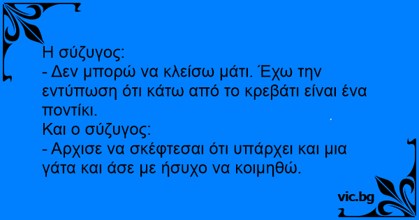 - Δεν μπορώ να κλείσω μάτι. Έχω την εντύπωση ότι κάτω από το κρεβάτι είναι ένα ποντίκι.