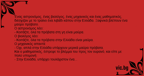 Ένας αστρονόμος, ένας βιολόγος, ένας μηχανικός και ένας μαθηματικός, διέσχιζαν με το τραίνο ένα λιβάδι κάπου στην Ελλάδα. Ξαφνικά βλέπουν ένα μαύρο πρόβατο.