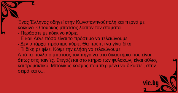 Ένας Έλληνας οδηγεί στην Κωνσταντινούπολη και περνά με κόκκινο. Ο τούρκος μπάτσος λοιπόν τον σταματά.